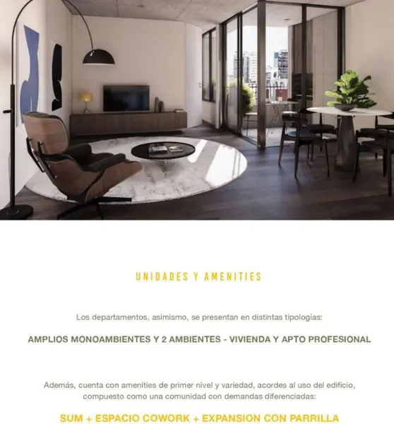 Exclusivo emprendimiento ubicado en la mejor zona de Palermo, próximo a Plaza Italia el Jardín Botánico y el Polo Gastronómico mas exclusivo de Buenos Aires.. El Edificio se desarrolla en 12 pisos y cuenta con un Local en Planta Baja, subsuelo y terraza común. FECHA ESTIMADA DE ENTREGA DICIEMBRE 2025. UNIDADES Y AMENITIES: Los departamentos se presentan en distintas tipologías: – Amplios monoambientes – 2 ambientes. Las unidades de 2 ambientes poseen baño y toilette, todos ofrecen cocinas incorporadas completamente equipadas: - Mesada de Silestone. - Griferias monocomando. - Alacenas y bajo mesada. - Revestimientos en porcelanato en baño y cocina. - Placard completo con frente e interior. - Tomas USB en toda la unidad. - Pre instalación para aire acondicionado. - Todas las unidades cuentan con balcones con parrilla individual. ¡UNIDADES IDEALES PARA VIVIENDA O INVERSIÓN! Cuenta con Amenities de primer nivel y variedad, acordes al uso del edificio, compuesto como una comunidad con demandas diferenciadas: – SUM – PATIO SEMICUBIERTO – GIMNASIO COMPLETAMENTE EQUIPADO. – ESPACIO COWORK - ESPACIOS BICICLETEROS. Contactános y coordiná una visita con nuestros asesores. Posee acceso para personas con movilidad reducida. * S.R.L. Mat CUCICBA 3269