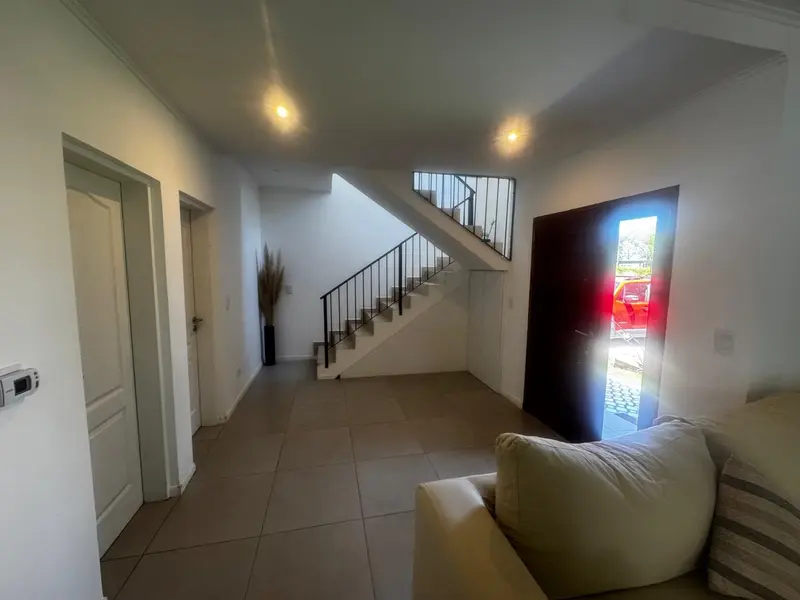 Ubicada en barrio cerrado San Alfonso - Pilar del Este. Propiedad de ocho meses de antigüedad, que consta de: Planta baja: Living, cocina y comedor integrados en concepto abierto, toallete, lavadero, baulera bajo escalera, galería techada con parrilla y cuarto de guardado. Planta alta: Dormitorio principal en suite con vestidor, dos dormitorios, baño compartido, balcón. Exterior: Hermoso parque y cochera descubierta para tres vehículos. Detalles de calidad, losa radiante en ambas plantas, caldera y pre instalación de aire acondicionado en todos los ambientes. Ambos baños cuenta con ducha escocesa.