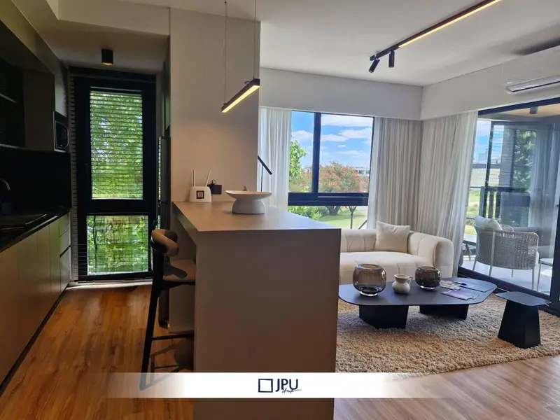 * El Canton - Escobar. Departamento en Venta. Obra Iniciada. Showroom de ventas disponible - Agenda tu visita a la unidad modelo. Precio de lista : USD 138.253 Proyecto único con vistas al golf y a la laguna en Escobar! Unidad en primer piso con terraza. Departamento de 2 ambientes con balcón aterrazado y parrilla. Excelente oportunidad para disfrutar la vida al aire libre, con la comodidad de vivir en un departamento. Se encuentra ubicado en el barrio El Cantón sobre Av. de los lagos en escobar, a 35' de la ciudad. El proyecto cuenta con 8 bloques de vivienda rodeados de terreno absorbente debidamente parquizado. Cada edificio tiene planta baja y tres pisos, los cuales poseen 19 unidades funcionales por bloque dando un total de 152 viviendas y 251 cocheras ubicadas en planta baja. El conjunto de vivienda posee como amenities; laundry por edificio, SUM, pileta, y juego para chicos rodeado de verde con vistas amplias al golf comunes a todos. Las tipologías son de dos y tres ambientes, todas cuentan con balcón, las ubicadas en planta baja poseen jardín propio y las ubicadas en el tercer nivel tienen terraza propia. Todas las unidades funcionales cuentan con una expansión semi cubierta. Estos balcones tendrán pisos y zócalos de porcellanato, barandas de aluminio vidriadas y artefactos de luz en cielorrasos. Los cielorrasos estarán revestidos con material símil madera de exterior. Se accede a ellos desde el living a través de carpinterías con vidrios DVH. Las puertas serán puerta placa MDF para pintar o revestidas, con marco de madera, herrajes platiles, Currao o similar. El interior de las viviendas contará con solados de porcellanato, SPC o similar. Cielorrasos aplicados o suspendidos con terminaciones de yeso o similar y pintado en interiores. Las cocinas de todas las unidades contarán con muebles de cocina con bajo mesada y alacena. Horno y anafe eléctrico 4 hornallas, grifería monocomando FV, Piazza o similar. Mesada y alzada de granito o similar, pileta de acero inoxidable marca Mi Pileta o similar. Para los baños se proveen pisos y paredes de porcellanato. Lavatorio marca Ferrum, Piazza o similar, bañera Ferrum, Piazza o similar o ducha, griferías monocomando FV, Piazza o similar, artefactos sanitarios Ferrum, Piazza o similar. Los dormitorios tendrán los frentes de placard corredizos con placa de melamina. La climatización en las viviendas contará con provisión piso radiante eléctrico y la preinstalación de aire acondicionado (no incluye equipos) La provisión de agua caliente será a través de termotanque eléctrico individual. Forma de pago El Precio publicado corresponde a una promoción por pago contado y tiempo limitado, Precio de Lista: USD *% Anticipo en dólares y cuotas + CAC INICIO DE OBRA MARZO 2024. Fecha estimada: Primer trimestre de 2027 Desarrolla Portland. Proyecto con certificación Edge Construcción sostenible. Edificios ecológicos. Contactanos para ver los avances de la obra. Aprovecha esta oportunidad!