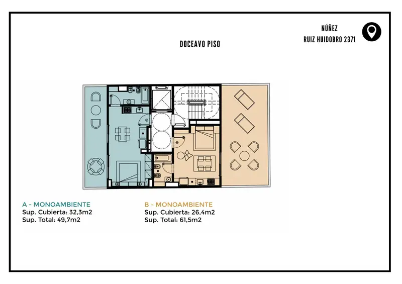 Altos de Ruiz Huidobro - Emprendimiento Premium en Núñez El Desarrollo Altos de Ruiz Huidobro es un emprendimiento de alta calidad diseñado con una arquitectura racional y funcional, priorizando el uso eficiente del espacio y terminaciones de primera categoría. El proyecto incluye: Planta baja y 12 pisos con departamentos de 1, 2 y 3 ambientes, todos con expansiones. Subsuelo que forma parte de un local comercial. Piso 13: Solarium con parrilla e hidromasaje, un espacio perfecto para descansar o compartir momentos únicos con amigos. Ubicación privilegiada Situado en Ruiz Huidobro 2371, en el corazón del barrio de Núñez, una de las zonas más codiciadas de la Ciudad de Buenos Aires. A media cuadra de la Av. Cabildo y a 10 del Parque Saavedra. Con excelente conectividad gracias al Metrobus y la proximidad al Puente Saavedra. Núñez es conocido por su vibrante oferta gastronómica y cultural, siendo ideal para jóvenes estudiantes y profesionales. El Proyecto El edificio está distribuido en: Monoambientes: Desde 36 m² hasta 62 m² . (Los metros incluyen espacios cubiertos, descubiertos y balcones aterrazados.) Modalidad de inversión Participación mediante fideicomiso al costo. Aporte inicial del 50% en USD. 24 cuotas iguales y consecutivas ajustadas según la variación dólar/CAC. Sustentabilidad y Tecnología El proyecto incorpora elementos para un estilo de vida más eficiente y respetuoso con el medio ambiente: Recolección de agua de lluvia. Circulaciones comunes ventiladas. Carpinterías con DVH (Doble Vidrio Hermético). Sistemas individuales de agua caliente. Iluminación de bajo consumo en áreas comunes. Calefacción por radiadores y/o losa radiante. Uso de productos sustentables en su construcción. Invierte en tu futuro en una ubicación estratégica y un desarrollo diseñado para disfrutar la vida al máximo. © 2025 Coldwell Banker. Todos los derechos reservados. Coldwell Banker y los logotipos de Coldwell Banker son marcas de servicio de propiedad de Coldwell Banker Real Estate LLC. El sistema Coldwell Banker® está compuesto por oficinas propias de propiedad de una subsidiaria de Anywhere Advisors LLC y por oficinas adheridas al Sistema Coldwell Banker que son de propiedad y operación independientes. En cumplimiento con la normativa vigente, los asistentes NO ejercen el corretaje inmobiliario. La intermediación y conclusión de las operaciones inmobiliarias es desarrollada por Martilleros y Corredores Públicos. Esta Oficina Inmobiliaria se encuentra a cargo de Alejandra González Carmona, CUCICBA 8444 adherida al Sistema Coldwell Banker Desiderio Group, CUIT *, Av. Directorio 709 CABA © 2025 Coldwell Banker. Todos los derechos reservados. Coldwell Banker y los logotipos de Coldwell Banker son marcas de servicio de propiedad de Coldwell Banker Real Estate LLC. El sistema Coldwell Banker® está compuesto por oficinas propias de propiedad de una subsidiaria de Anywhere Advisors LLC y por oficinas adheridas al Sistema Coldwell Banker que son de propiedad y operación independientes. En cumplimiento con la normativa vigente, los asistentes NO ejercen el corretaje inmobiliario. La intermediación y conclusión de las operaciones inmobiliarias es desarrollada por Martilleros y Corredores Públicos. Esta Oficina Inmobiliaria se encuentra a cargo de Alejandra Gonzalez Carmona CUCICBA 8444 adherida al Sistema Coldwell Banker Desiderio Group, CUIT *, Av. Directorio 709 CABA. y Ferreyra Patricia Alejandra CMCPSI 6409 Libro 10 Folio 8 adherida al Sistema Coldwell Banker Desiderio Group, CUIT *, Av. Centenario 2211 Beccar, Partido de San Isidro, Pcia. de Buenos Aires.