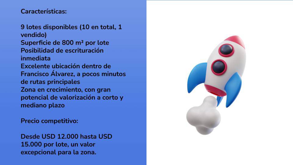 ¡Invertí en una de las zonas con mayor crecimiento de Francisco Álvarez! Este lote de 807 m² es ideal para construir tu casa, desarrollar un proyecto o hacer una excelente inversión en una ubicación estratégica. Características destacadas: ✅ Precio único en la zona, oportunidad para venta rápida. ✅ Ubicación estratégica, con acceso rápido a Ruta 5 y Autopista Oeste. ✅ Zona en expansión, con potencial de revalorización a corto plazo. ✅ Ideal para vivienda o inversión, con espacio para múltiples opciones de construcción. ✅ Posesión inmediata ¡No dejes pasar esta oportunidad! Contáctanos hoy mismo y coordiná una visita para conocerlo en persona.