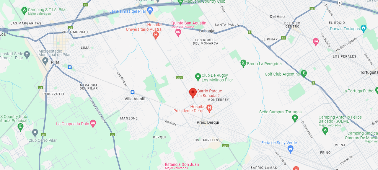 BARRIO PARQUE LA SOÑADA 2 - DERQUI Es un barrio abierto de 251 lotes entre 375 a 450 m2 en Derqui, Partido de Pilar. Ideal para inversión, en etapa de preventa. CARACTERÍSTICAS DEL BARRIO - 0% de anticipo. - Precios de referencia desde USD 26.500 - Posesión prevista para Mayo 2025. - Sin expensas. - Sin reglamento de construcción. - Financiamiento hasta 84 cuotas. ACCESO Y ALREDEDORES Excelente ubicación sobre la ruta 234,cerca de centro comercial y estación de tren San Martin. Con un muy buen acceso al transporte público y colegios. Cercano a la Zona del Hospital Austral. INFRAESTRUCTURA -Calles Asfaltadas -Electricidad Domiciliaria -Tendido eléctrico - Luminaria municipal FINANCIAMIENTO Anticipo desde 15% y hasta 84 cuotas fijas en bolsas de cemento, en pesos. Compra de contado: 5% de bonificación sobre precio de lista.
